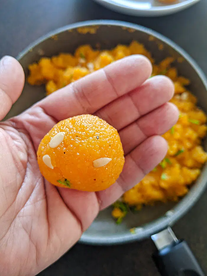 - When you see, that all the sugar syrup has been absorbed, mix it well, apply some oil or ghee on your palms, and shape the ladoo.