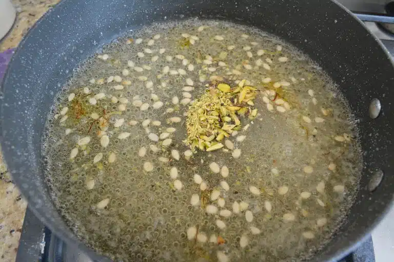 - In hot sugar syrup, transfer the prepared boondi, and add melon seeds (magaz) to it. Mix it well and make sure to coat all the boondi with sugar syrup.